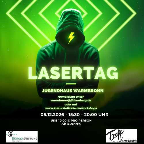 Gemeinsam wollen wir mal raus aus dem Haus und auf einen Ausflug gehen, in dem wir als Gruppe Lastertag spielen. Ein Ausflug mit Spiel, Spaß und Freude, der gemütlich bei selbstgemachter Pizza im Treff Warmbronn endet. Lasertag ist ein im Wesentlichen recht kostenintensives Angebot. Mit unserem Ausflug wollen wir auch Jugendlichen aus finanziell schwächeren Familien dieses Erlebnis erfahrbar machen.